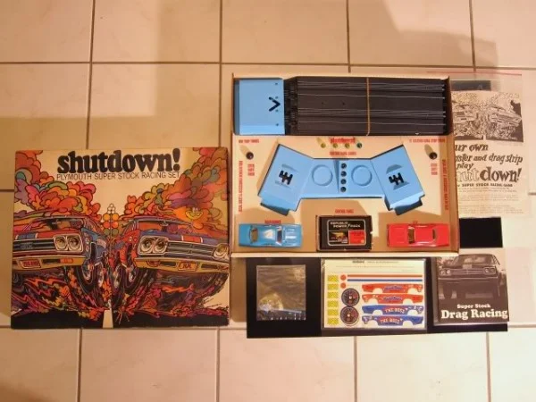 I love this box cover, and since I was a big slot racing fan in my youth, I wanted to learn more about the set. The first thing I found was this video that shows the unboxing of a vintage set. I'm blown away by the level of detail this set has. Since the set was featuring Plymouth branding, the cars themselves were perfect in every detail. What really got me was the level of design in the supporting print materials. Unfortunately, we don't get to see the set run, but I can understand why – this set has all the original packaging, including the poly envelopes and car decals, full intact.